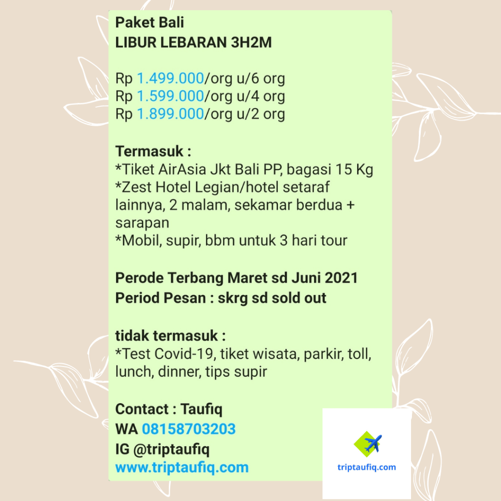 March 23, 2021 Paket Bali Libur Lebaran Share this: Click to share on X (Opens in new window) X Click to share on Facebook (Opens in new window) Facebook More Click to share on Tumblr (Opens in new window) Tumblr Click to share on WhatsApp (Opens in new window) WhatsApp Like Loading...